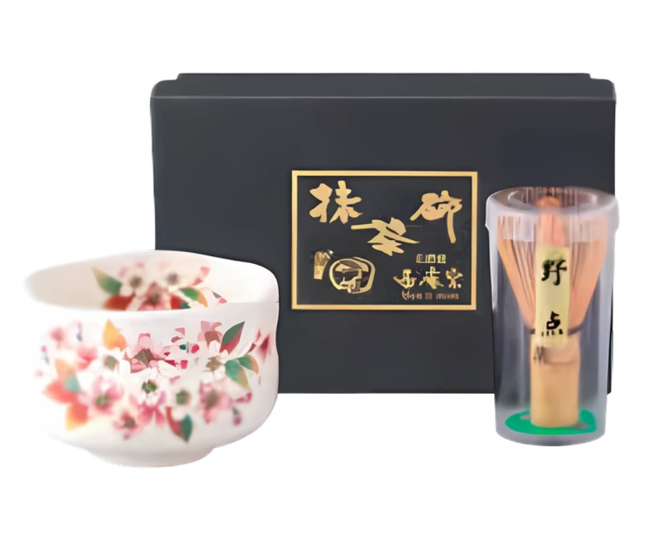 "Seian" Cherry Blossoms with Powdered Finish Tea Bowl and Tea Whisk Set